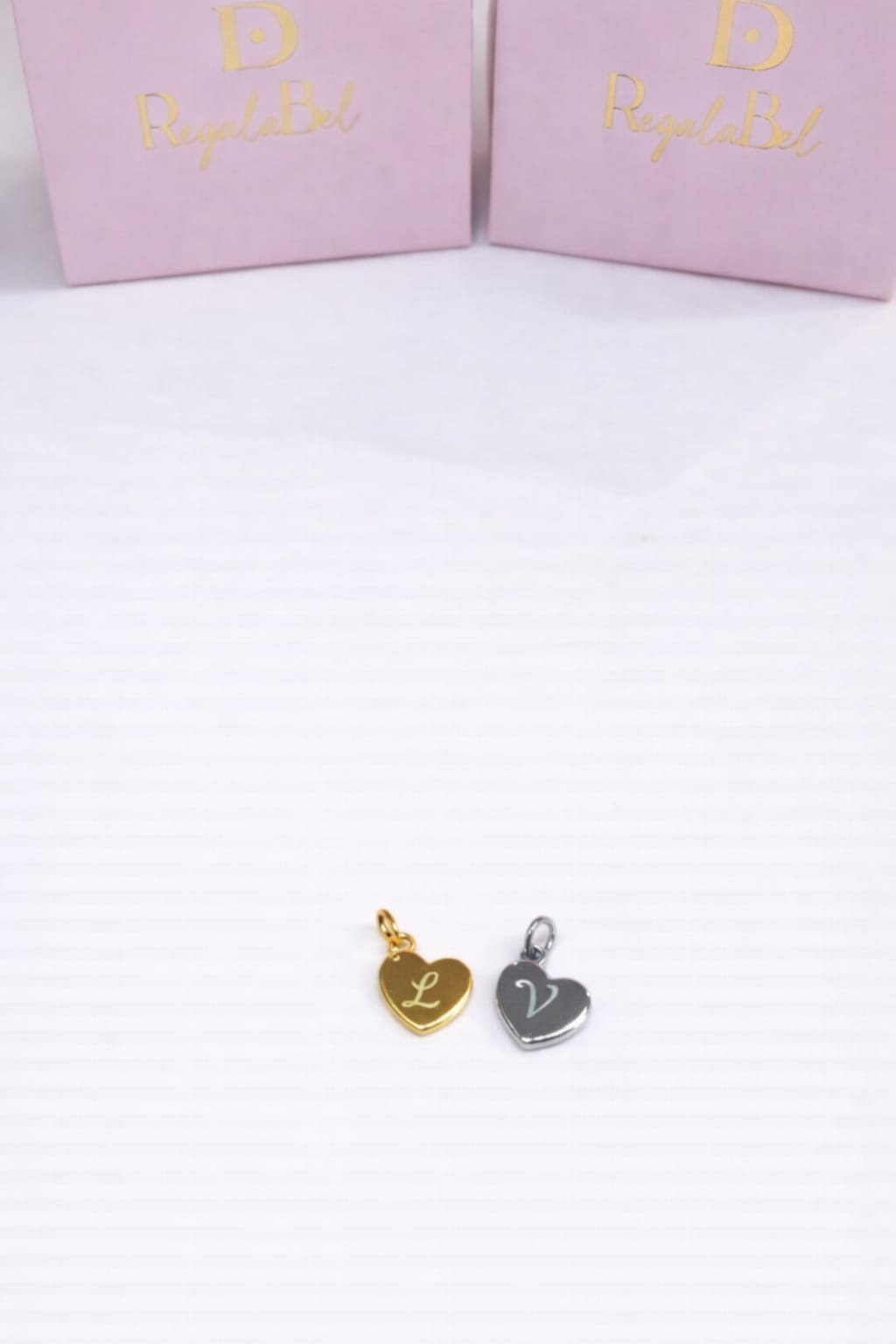 Charm corazoncitos en plata rodiada y plata bañada en oro grabable con inicial cantidad